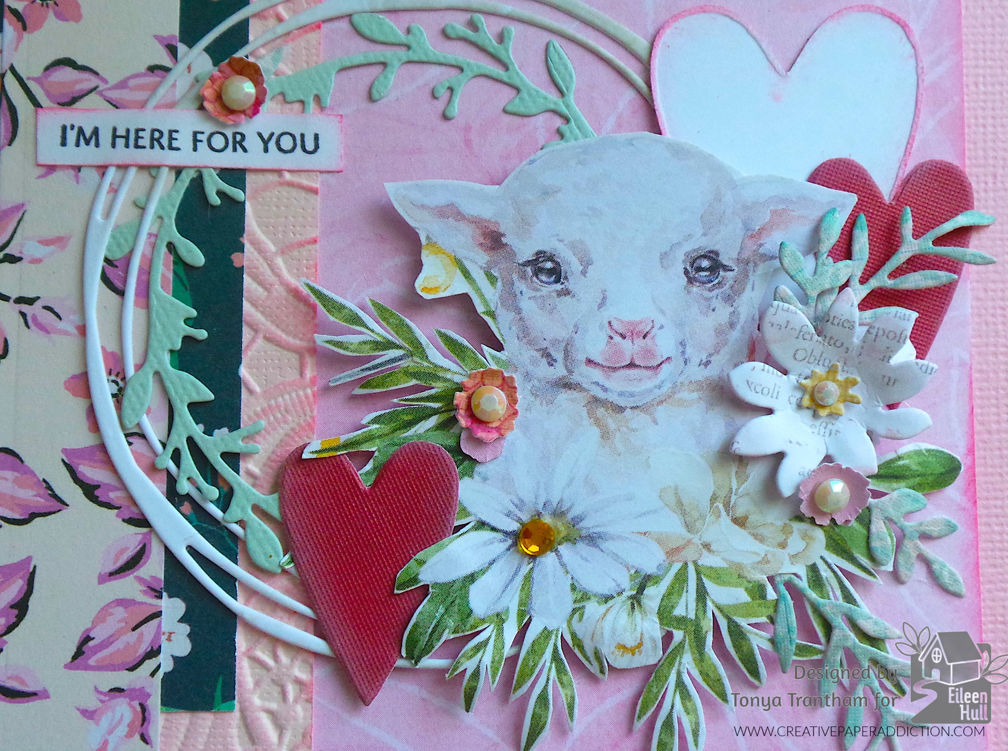 I cut three small flowers and a large flower with center flower from the Windowsill Flowers and Vase Thinlits. I cut four leaf sprigs from the Home Sweet Home Thinlits. I shaped with a Stylus and glued all to the lamb. I placed Yellow and White Gems to the center of each flower.