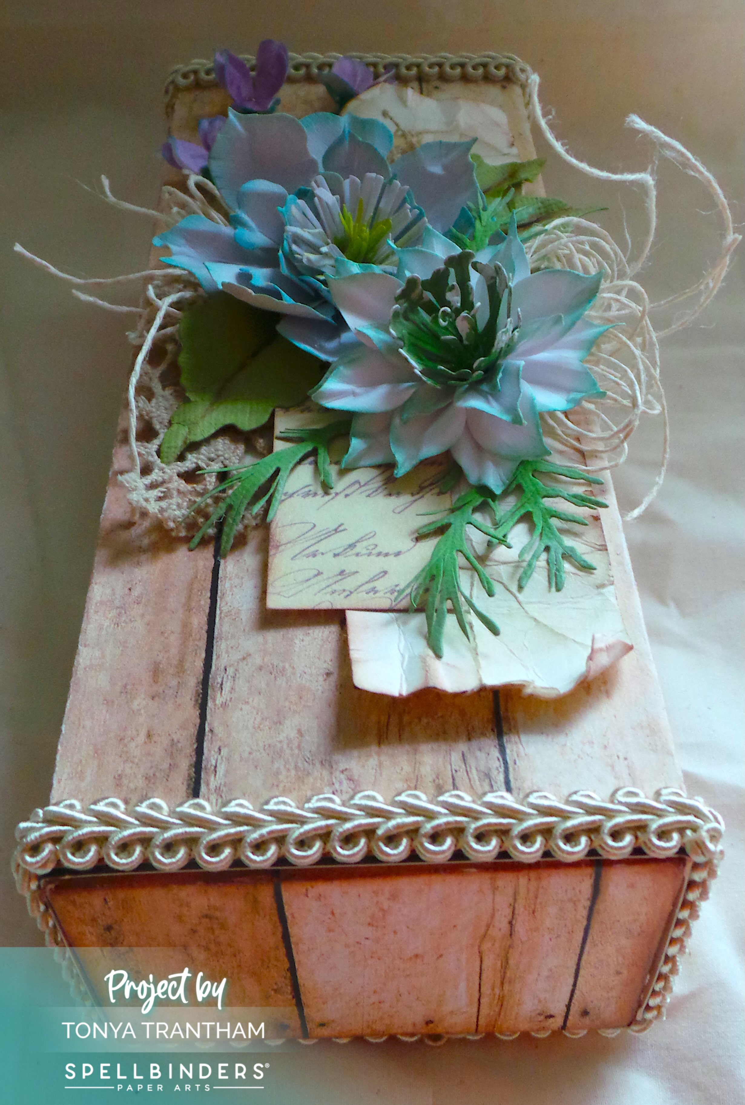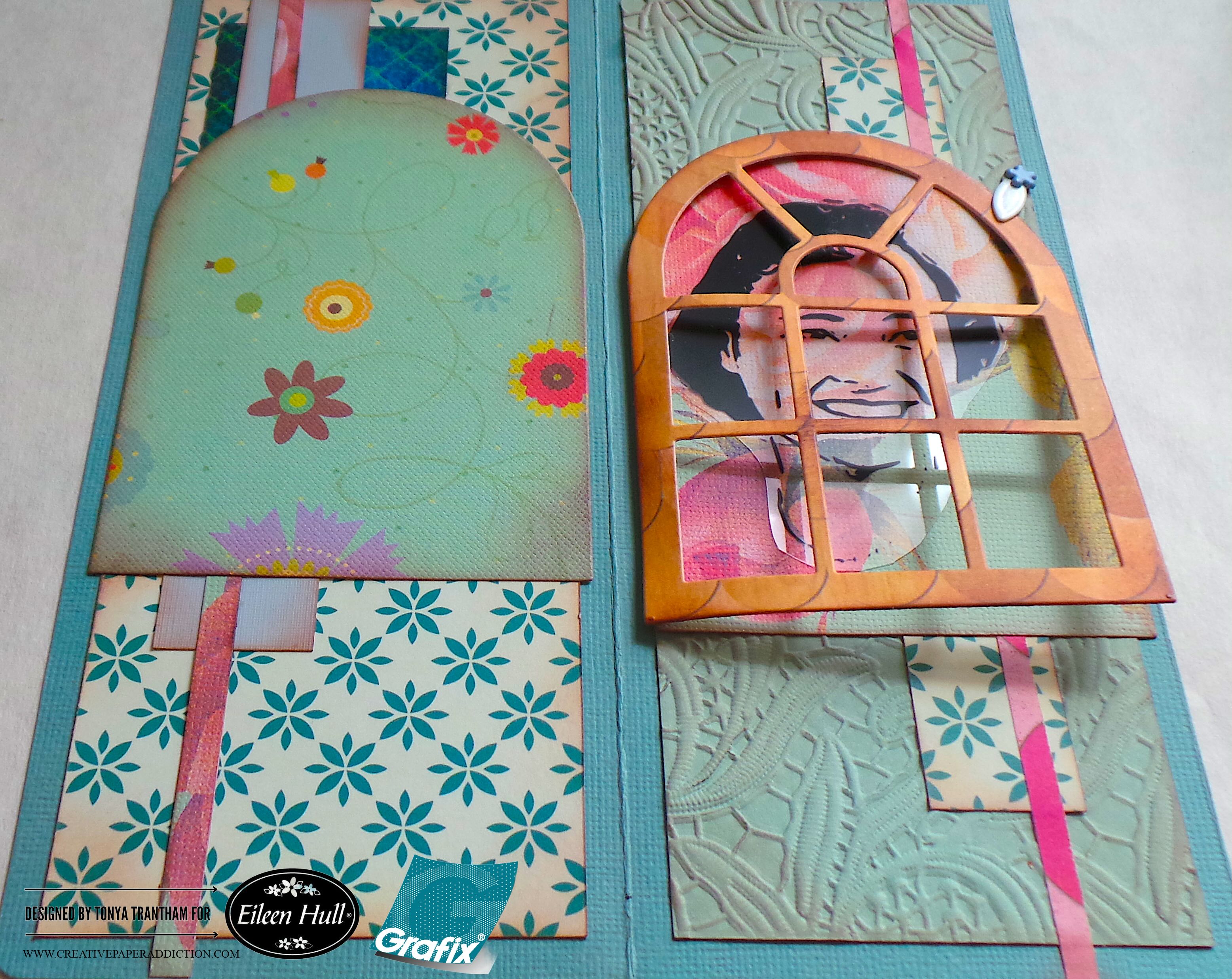 I added the extra piece of Lacy Leaves A5 Embossing Folder to the outside of the pocket along with some strips of patterned cardstock. I cut a piece of patterned cardstock slightly smaller and glued to the back side of the pocket. I also added a few strips of cardstock to the back. Next I cut out two of the largest Tunnel Arches Thinlits. I cut out the windowsill from the Windowsill Flowers and Vase Thinlits. I folded a piece of cardstock to create a hinge.
