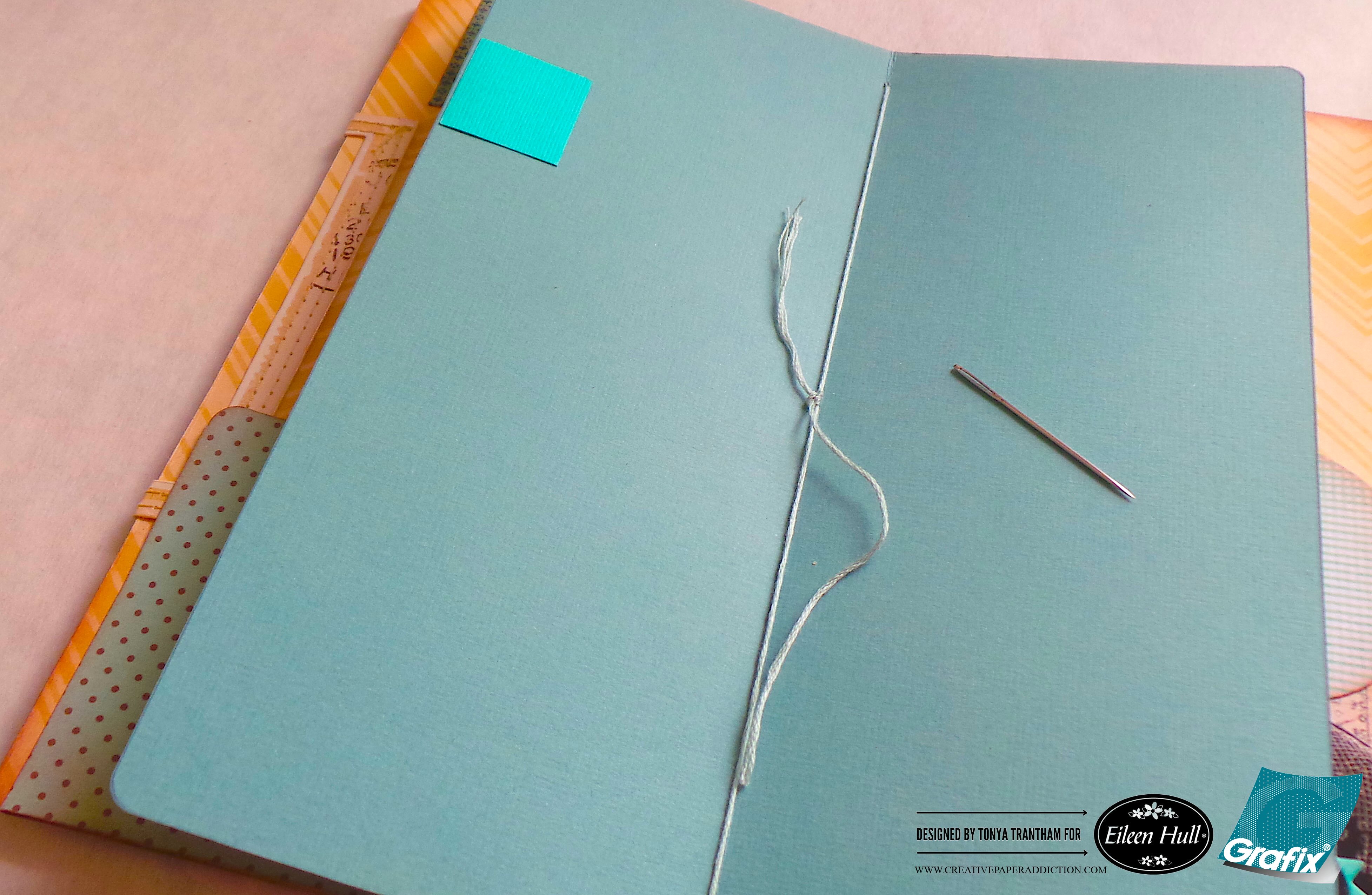For the inside pocket I folded a piece of cardstock in half and placed below the cut lines of the spine of the Journal Diecut. I marked the holes on the inside of pocket and used the needle to poke holes in the spine. I threaded the needle with thread and stitched the pocket onto the spine of the journal. I added glue at each end to create the pocket.