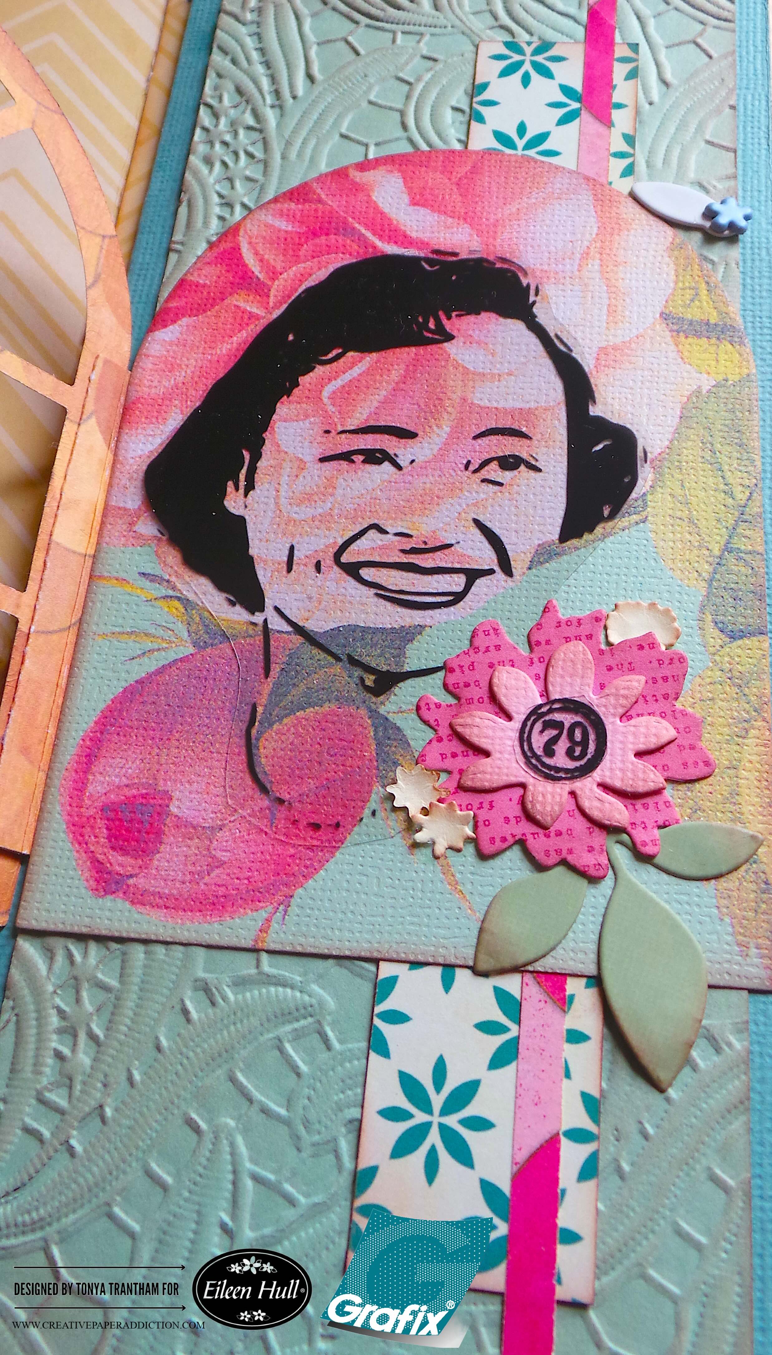 I cut out the following dies: Floral Pocket and Paperclips Thinlits, two of the largest flowers and a leaf sprig. Windowsill Flowers and Vase Thinlits, two large flowers and five of the smaller flowers. Home Sweet Home Thinlits, three leaf sprigs. I used one of the largest flower, one large flower, three of the small flowers and a leaf sprig and placed next to the woman and bottom corner. I cut the number “79” from the clear film and added to the center of the flower.