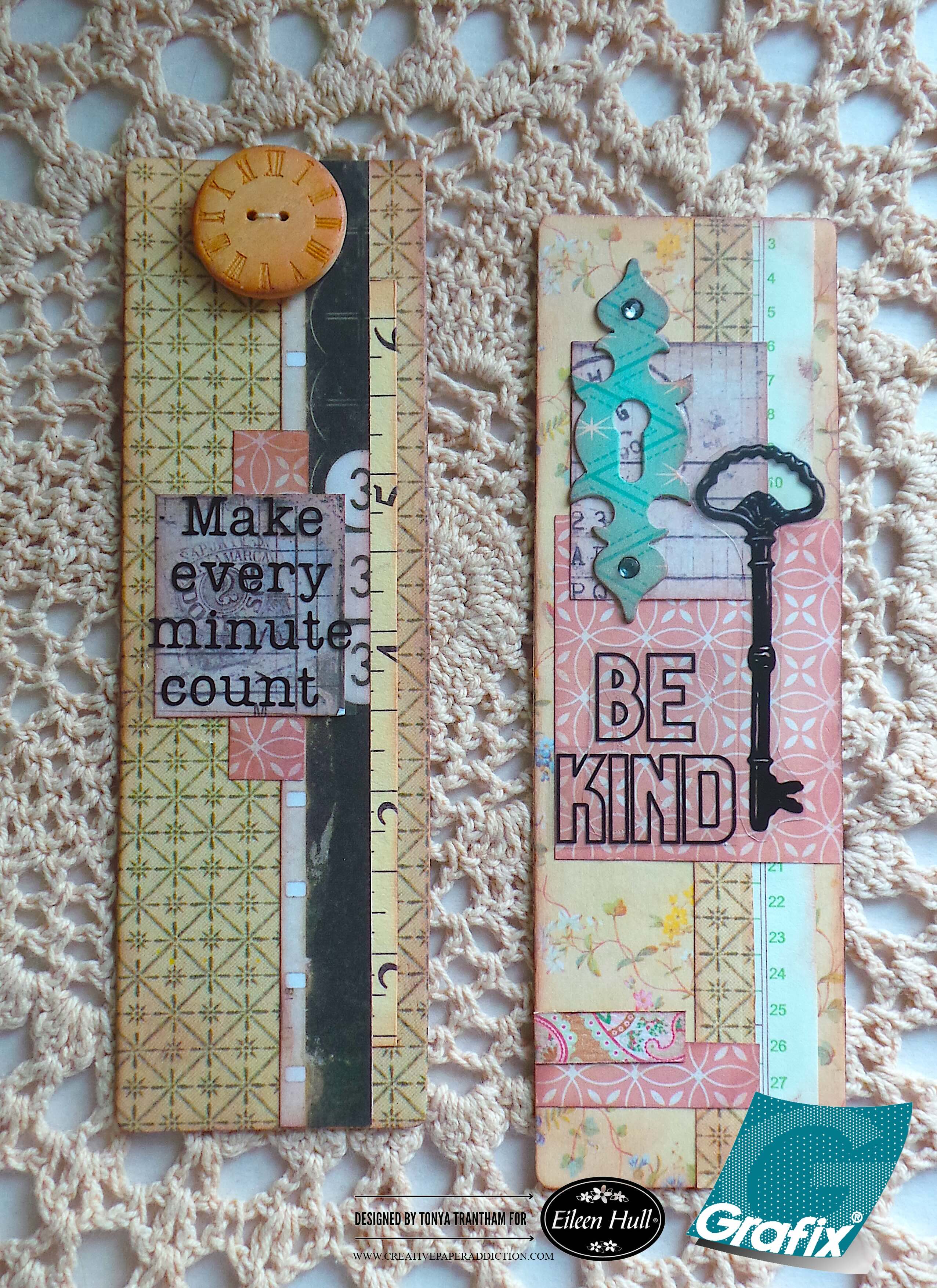 On the front side of both the bookmarks I dug into my stash of scraps of cardstock and glued strips of patterned cardstock to the base of the bookmark. Side note, this is a great way to use up what you have lying on your desk. I added the clear film “Make Every Minute Count” sentiment from the Grungy Vibe by Cat Kerr to the book mark along with a clock button from my stash to finish.