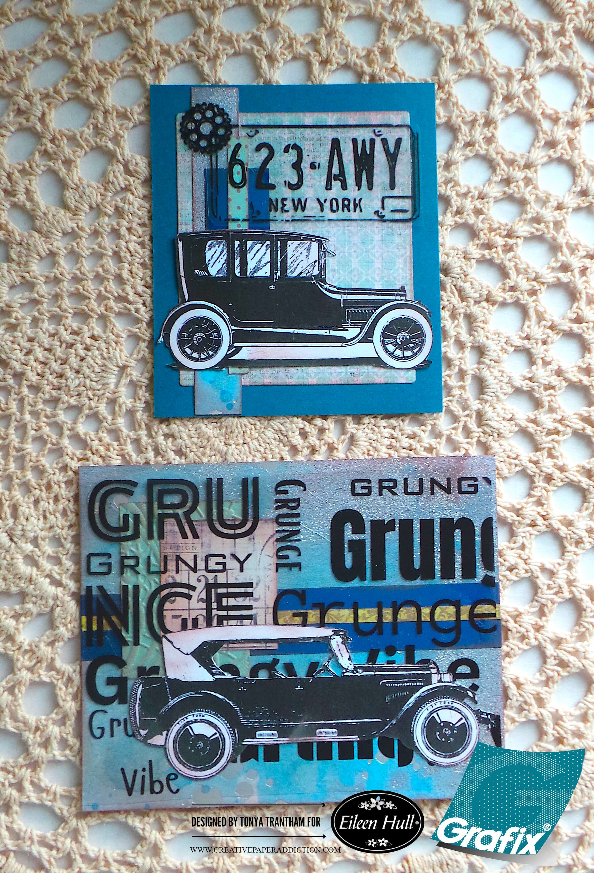 I cut two tags from cardstock for the belly band on the inside of the back cover. I added an assortment of scraps of cardstock to each tag. The first tag I cut the clear film license plate and gear and for the second tag I added the clear film “grungy vibe” overlay and adhered to each respective tag. I found these vintage cars in my stash so I added them to each tag.