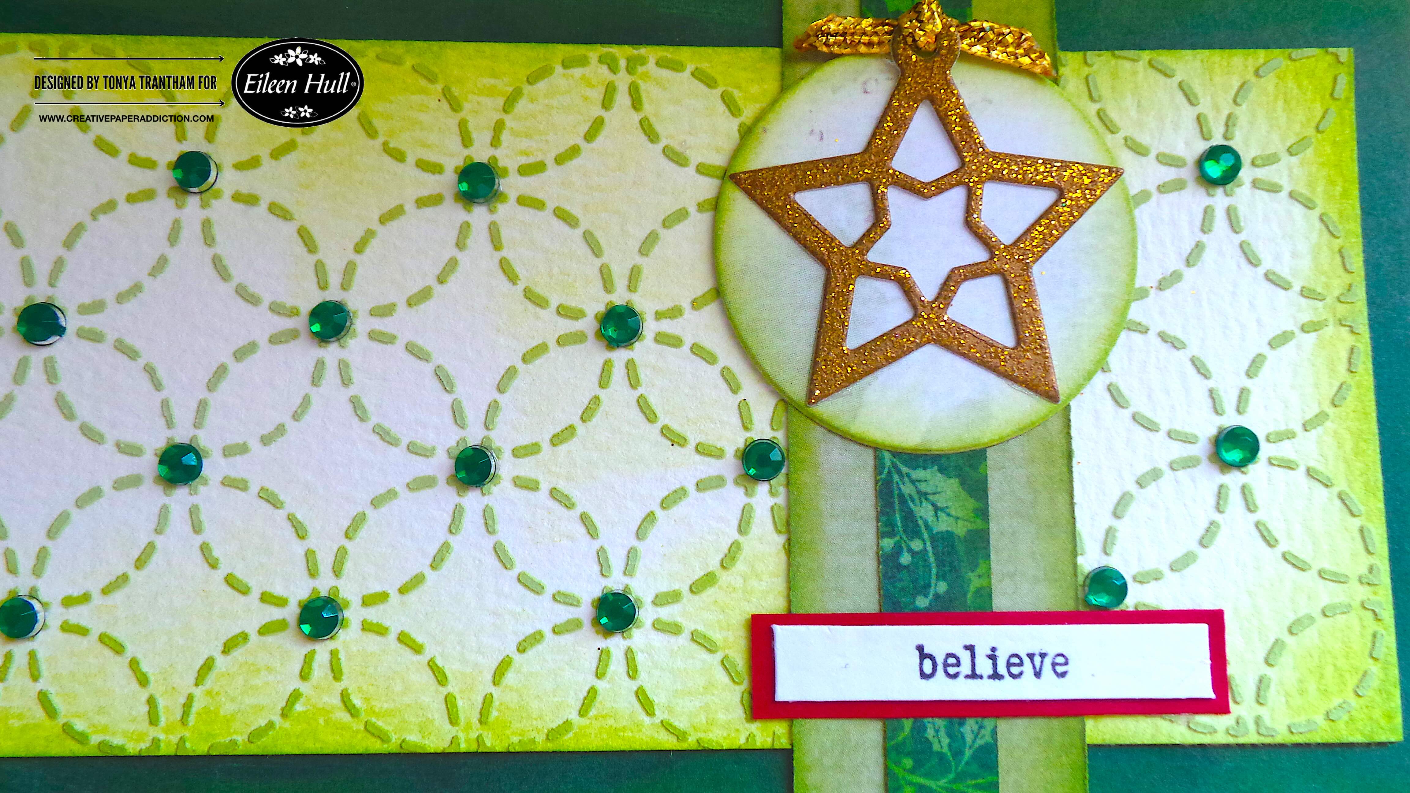 I added green gems to the stenciled image. I also cut a circle from the Bookmark, Pockets and Toppers Thinlits and adhered to the card.