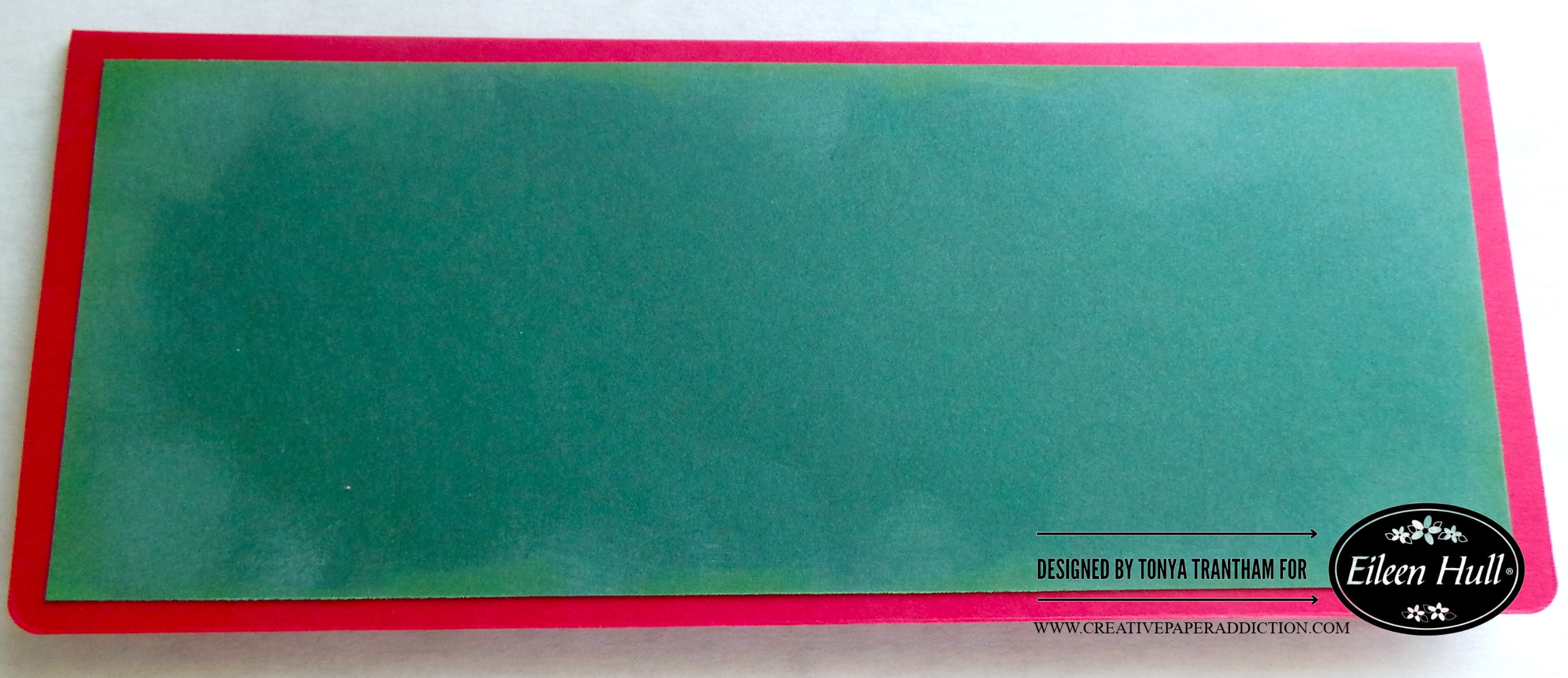 Since the stenciled image wasn’t as long as the card base. I cut to fit, lightly inked the edges with a green chalk ink before gluing to the card.