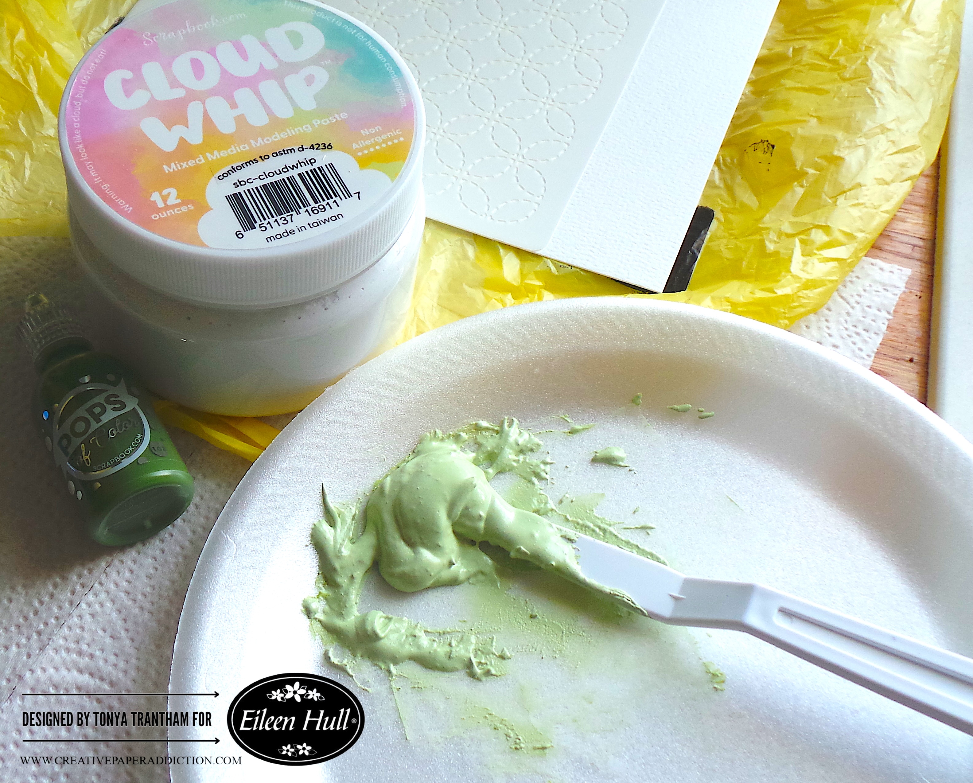 I added a dollop of Cloud Whip to a paper plate. Then, I slowly added Olive Pops of Color. I mixed it with a Mix Media Spatula until I got the right shade of green.