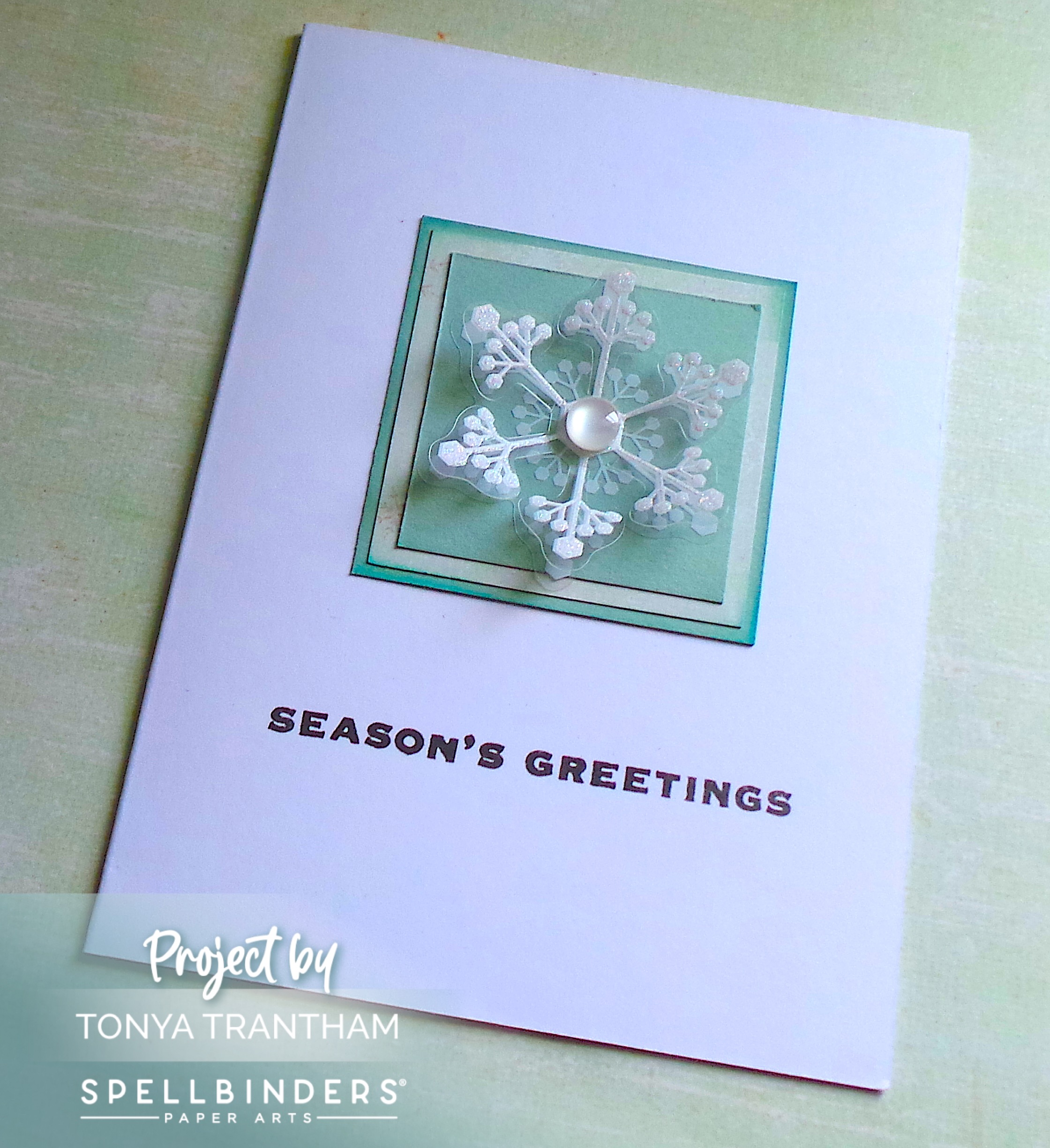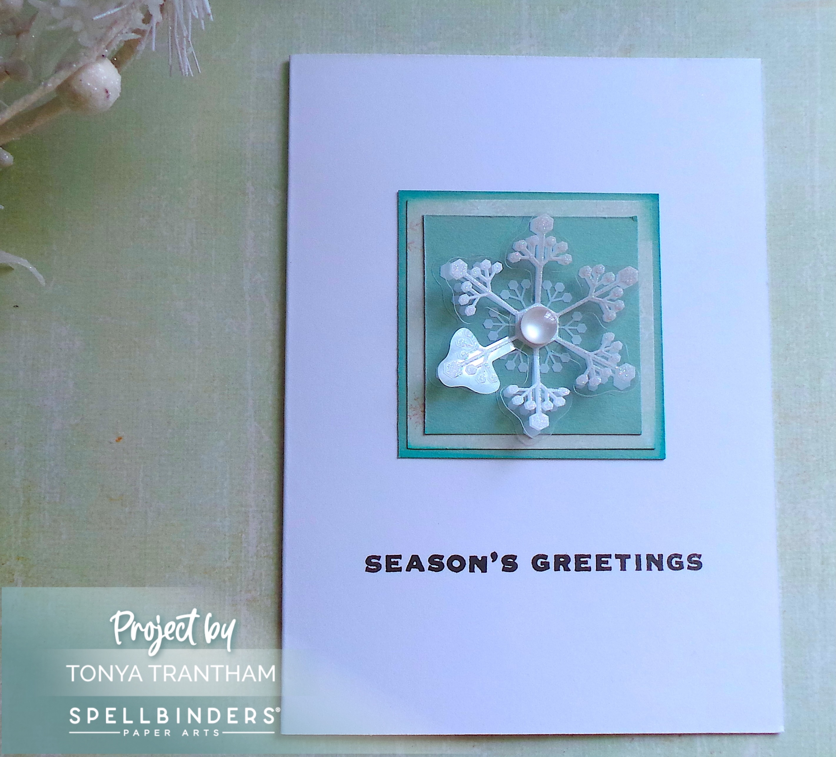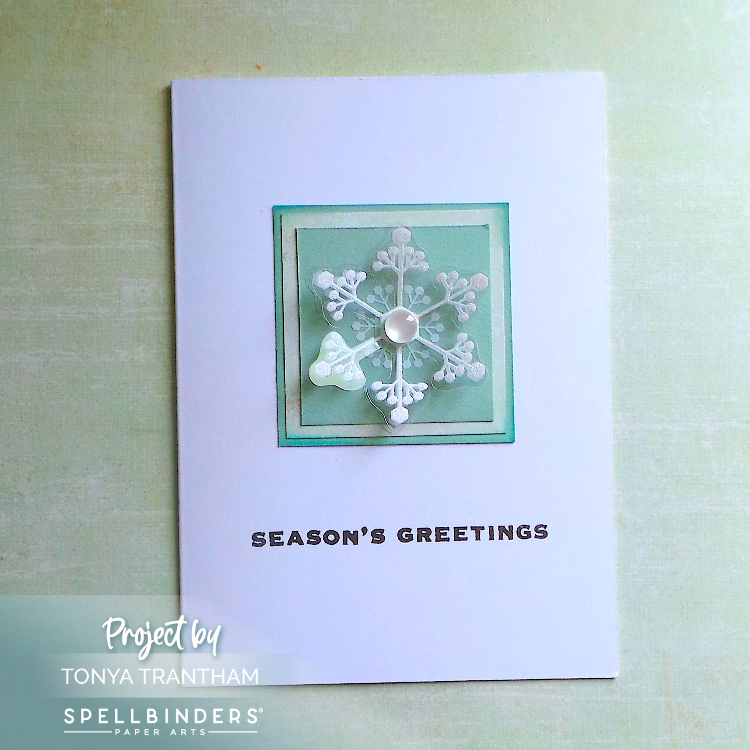 I placed one of the snowflakes from the Merry Moments Dimensional Snowflakes in the center of the matted squares. I added a Flatback Pearl to the center of the snowflake to finish.