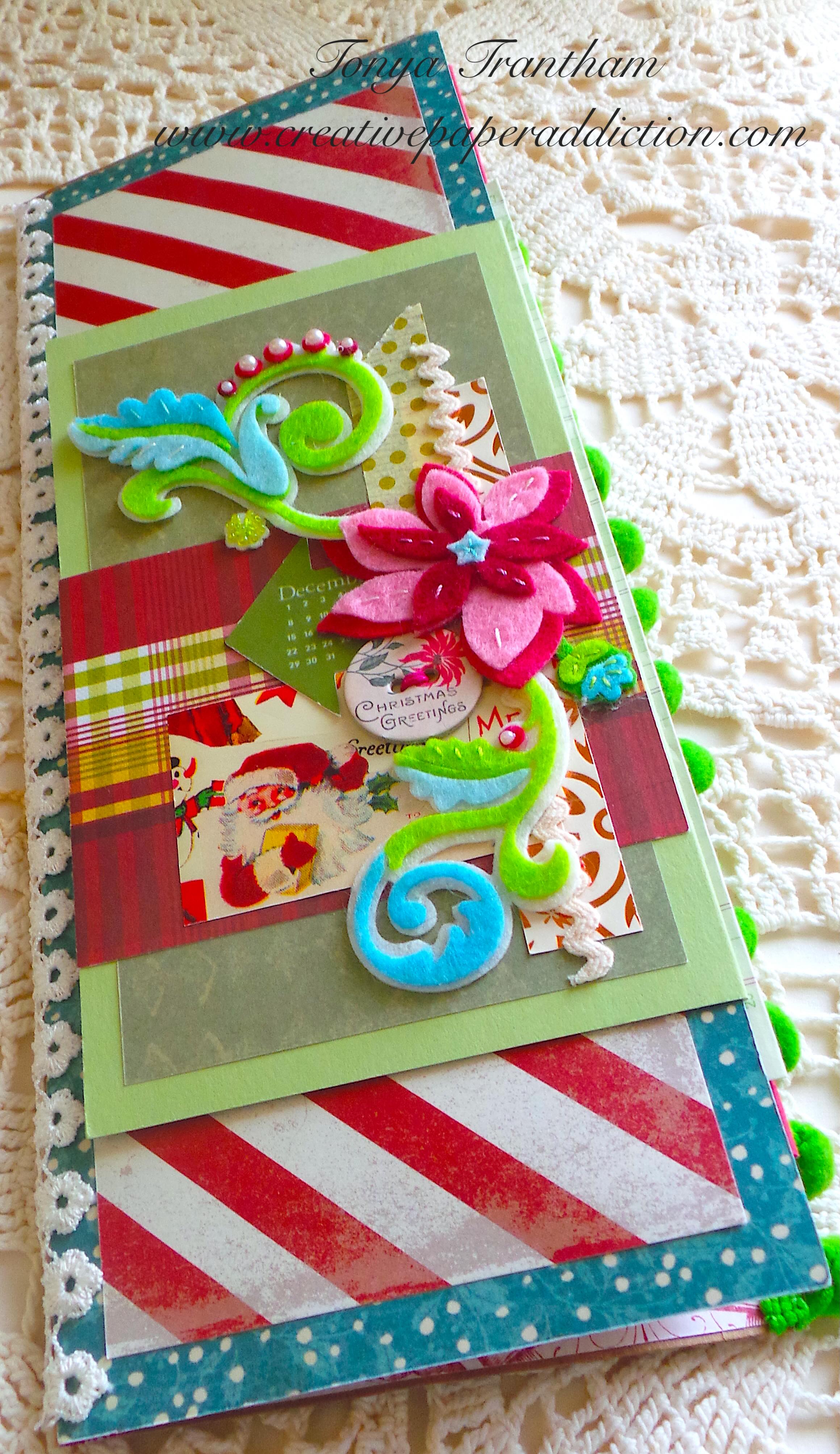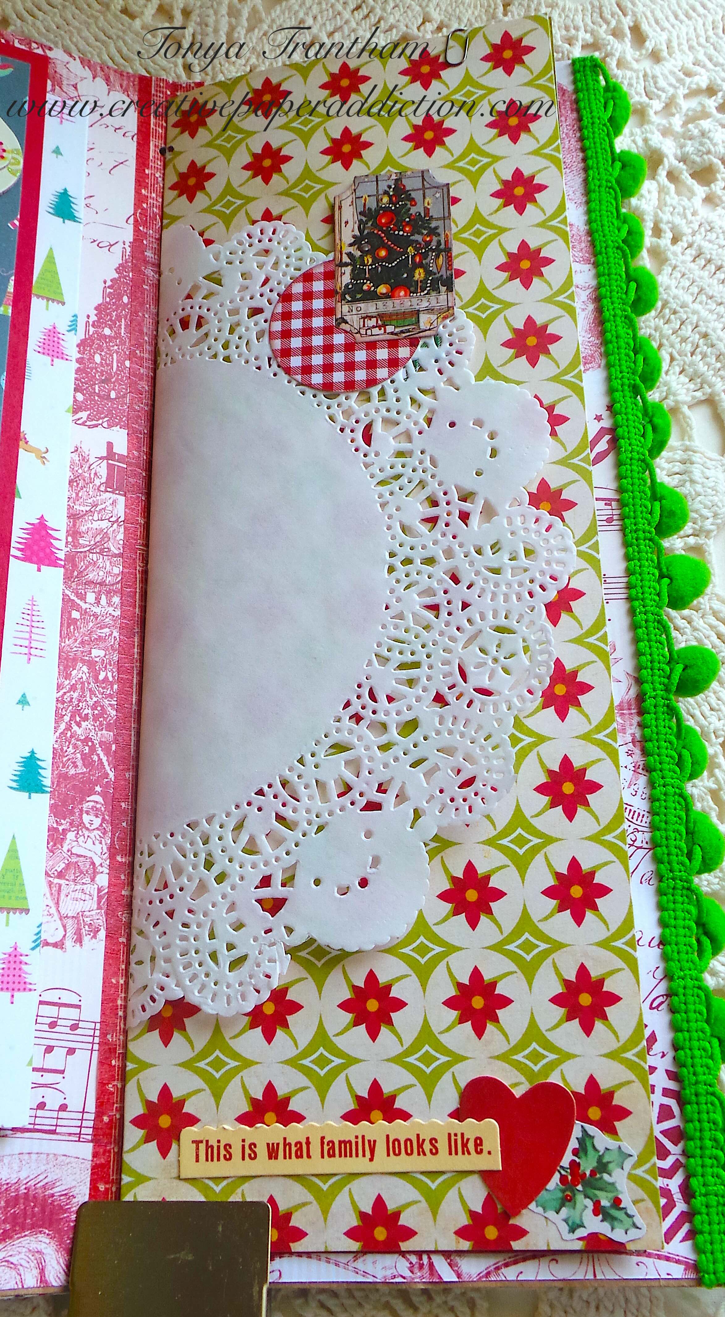 This set of pages includes three total too. I decorated the page with poinsettias with a cut a part and scraps of cardstock. The back page I added Pom Pom trim to finish.