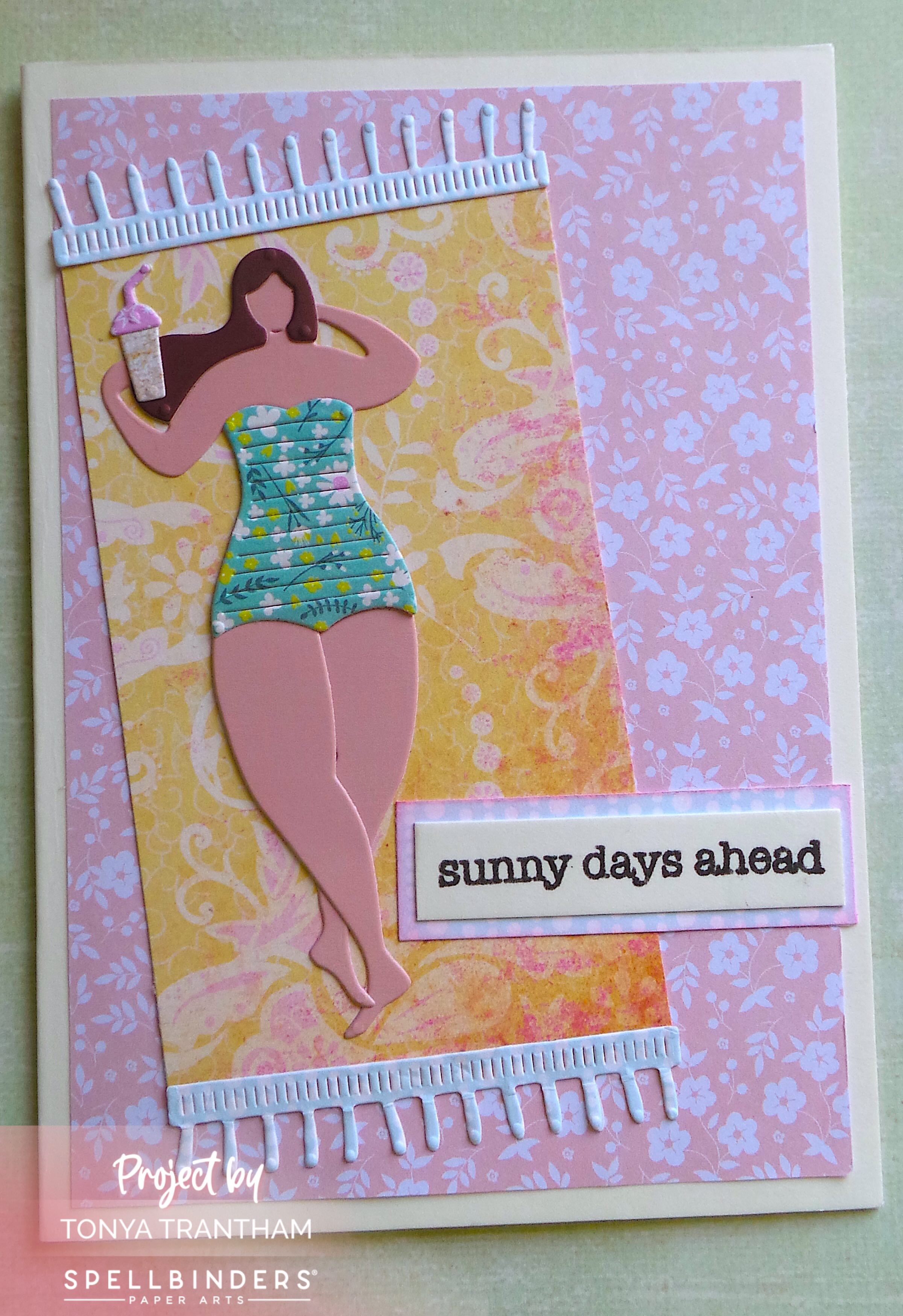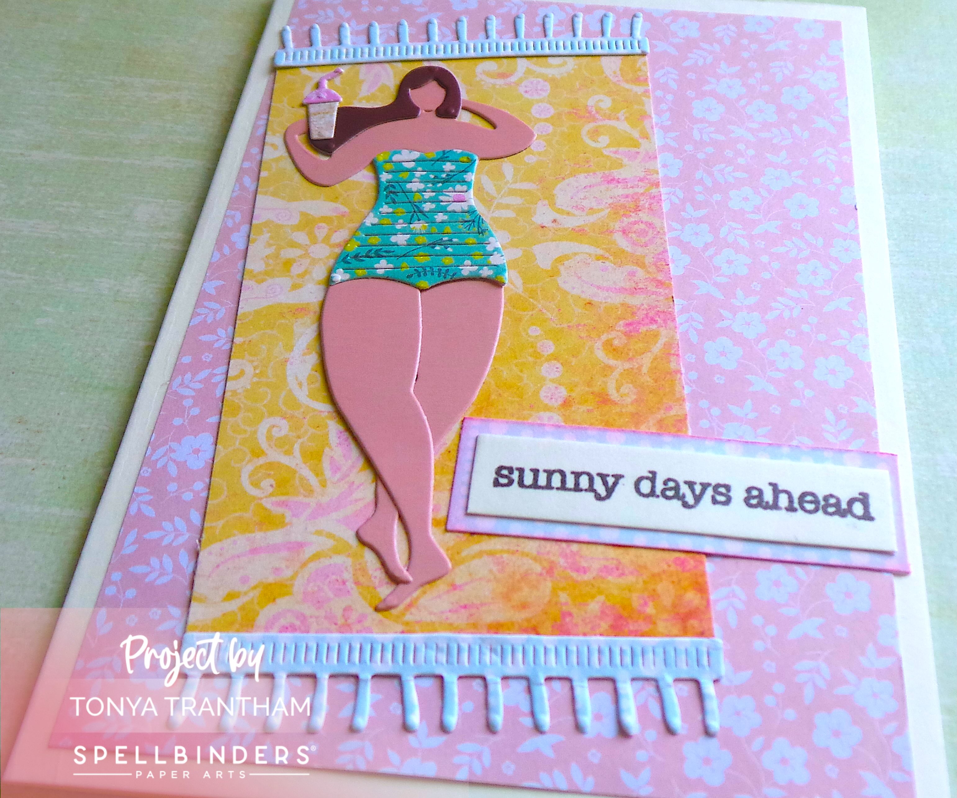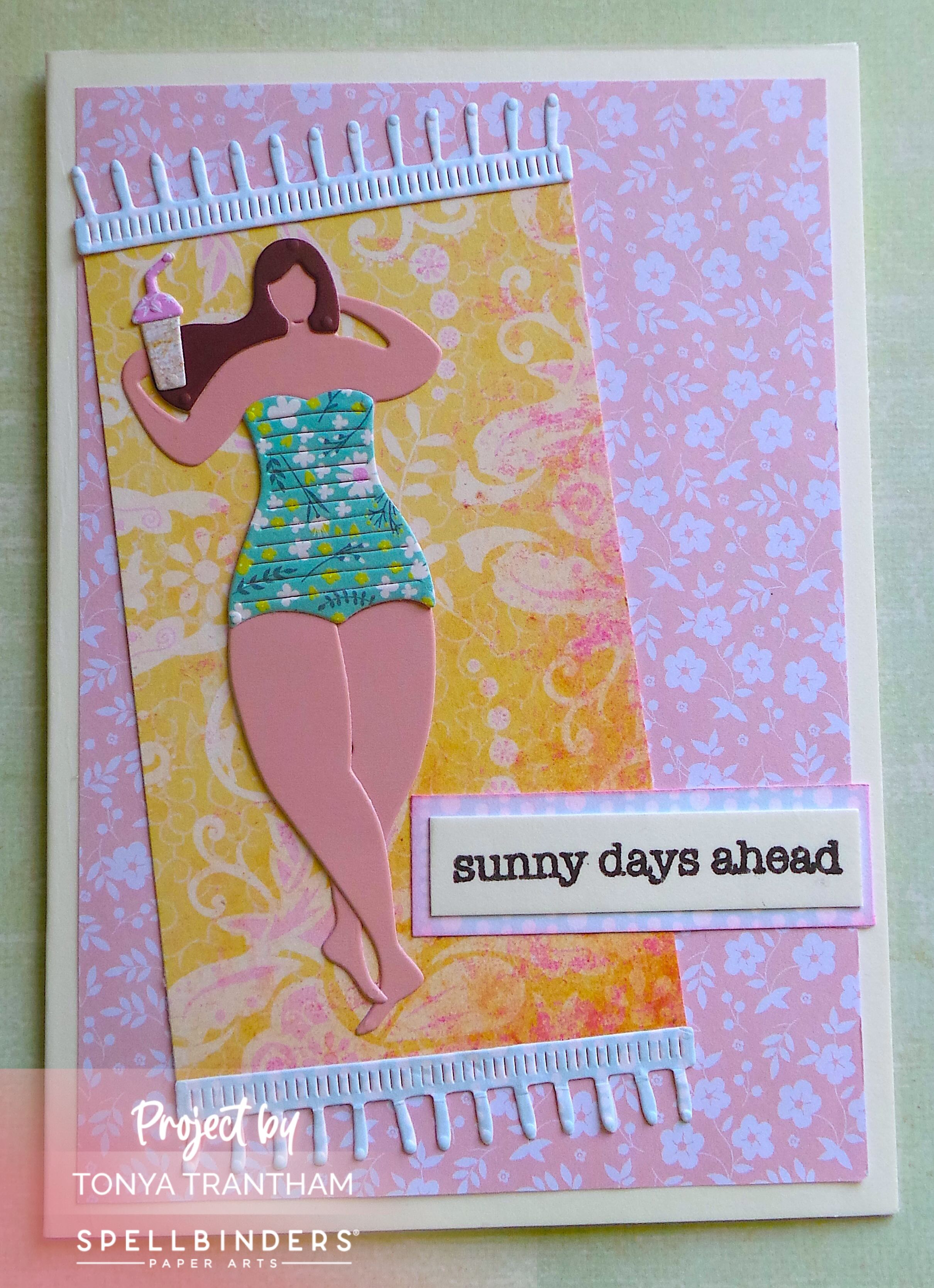 I placed the fringe on either end of the piece of cardstock and glued at an angle onto the card. Next I added the sun bather on top of the “blanket”.